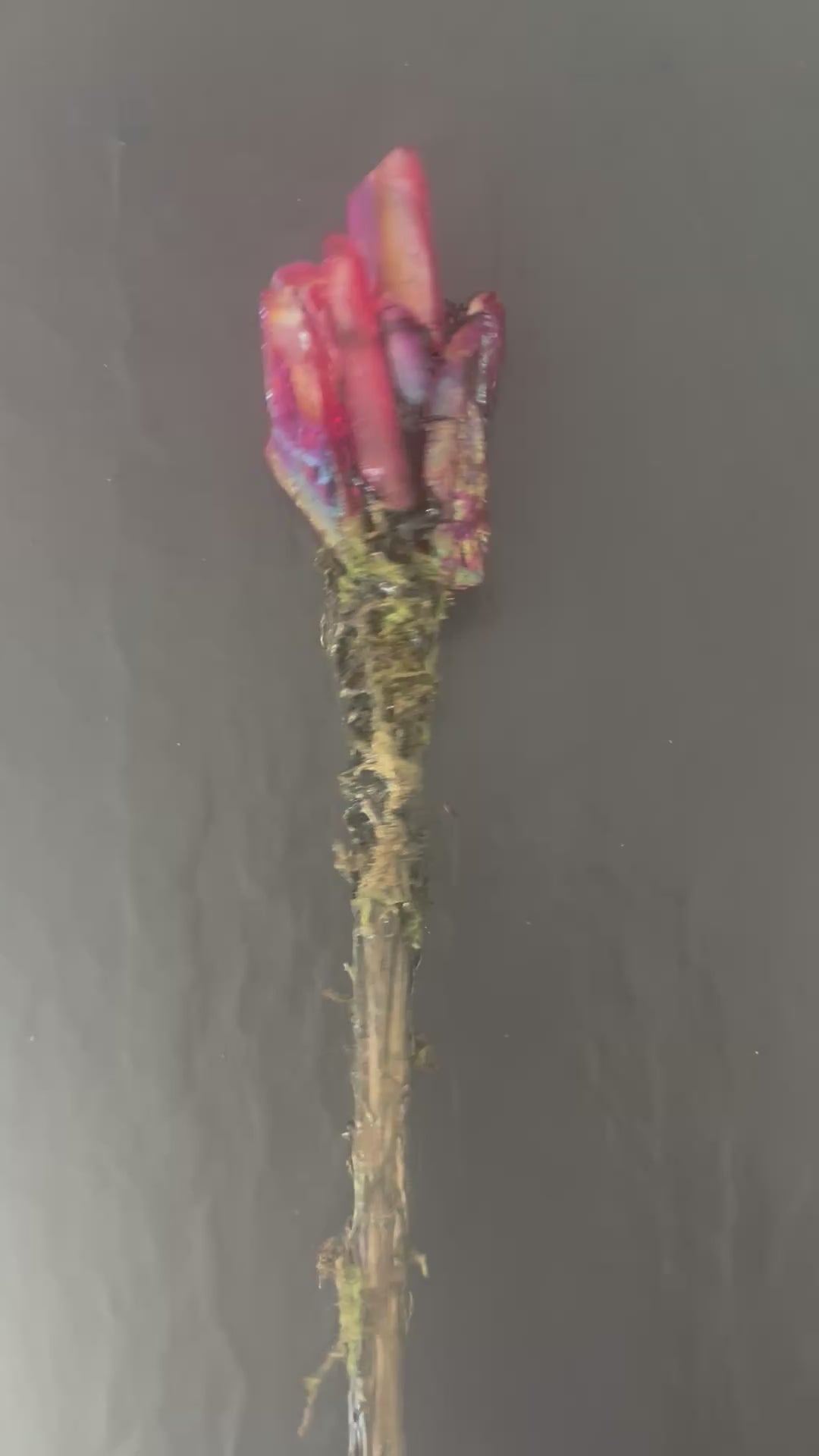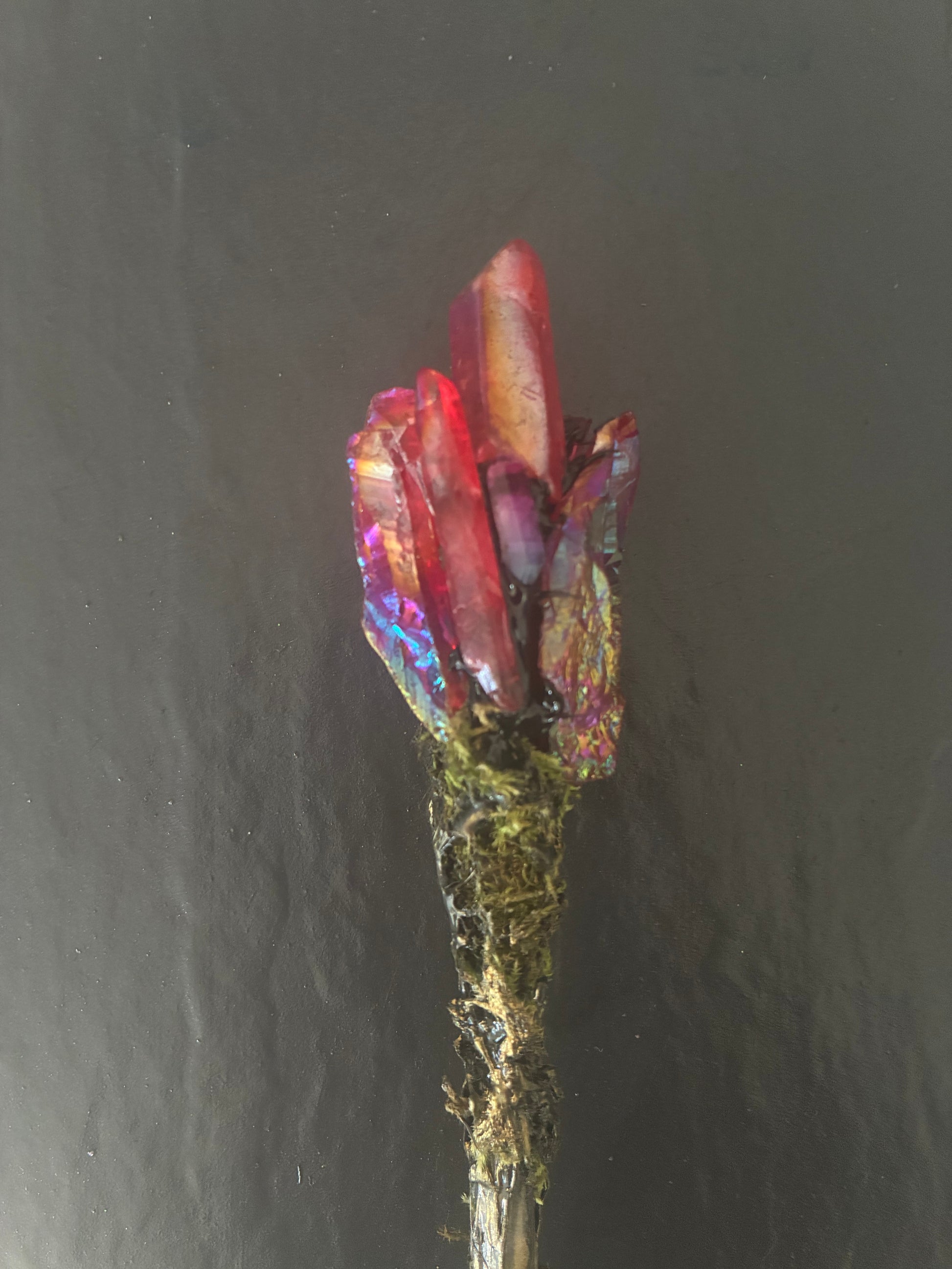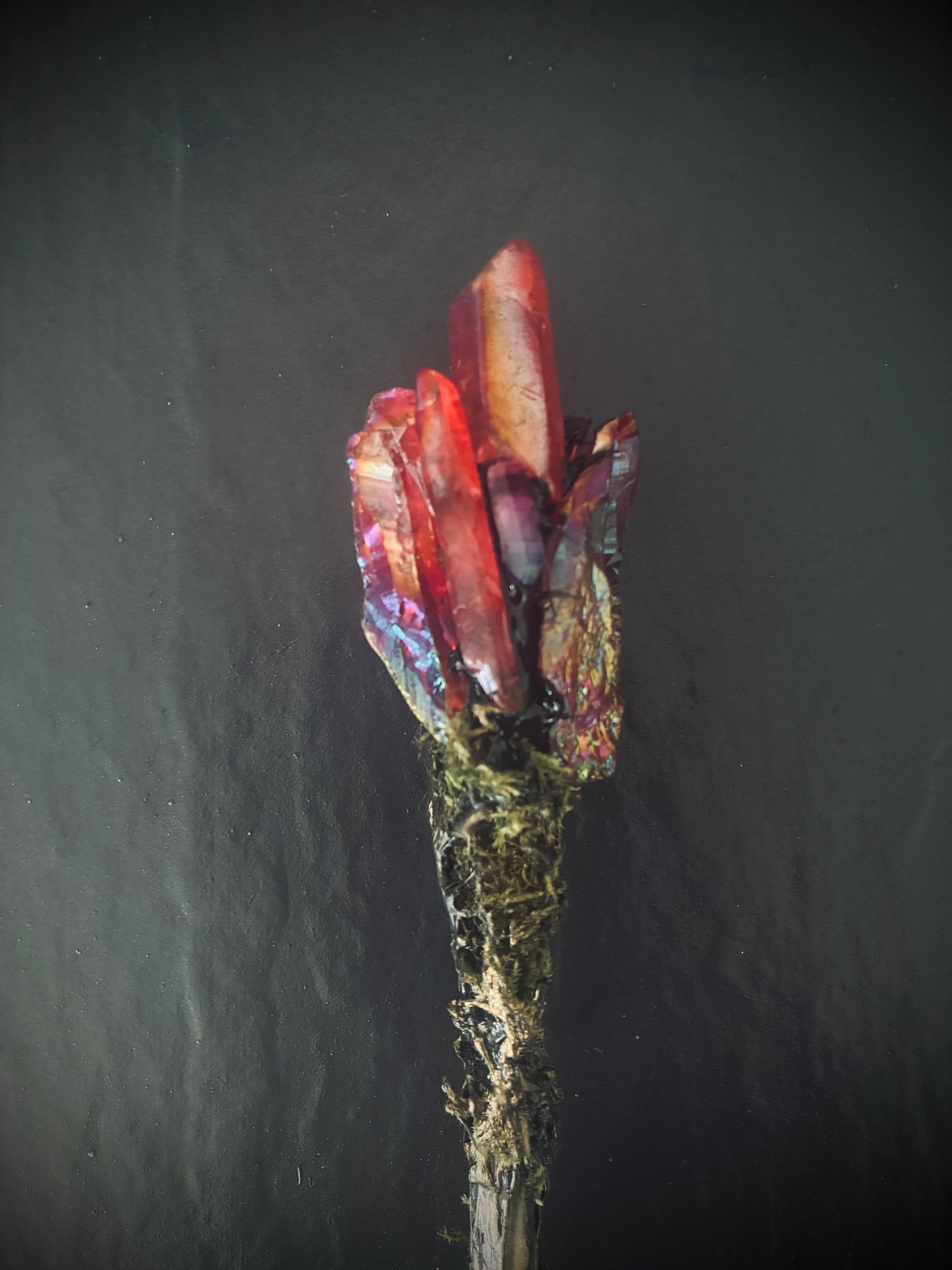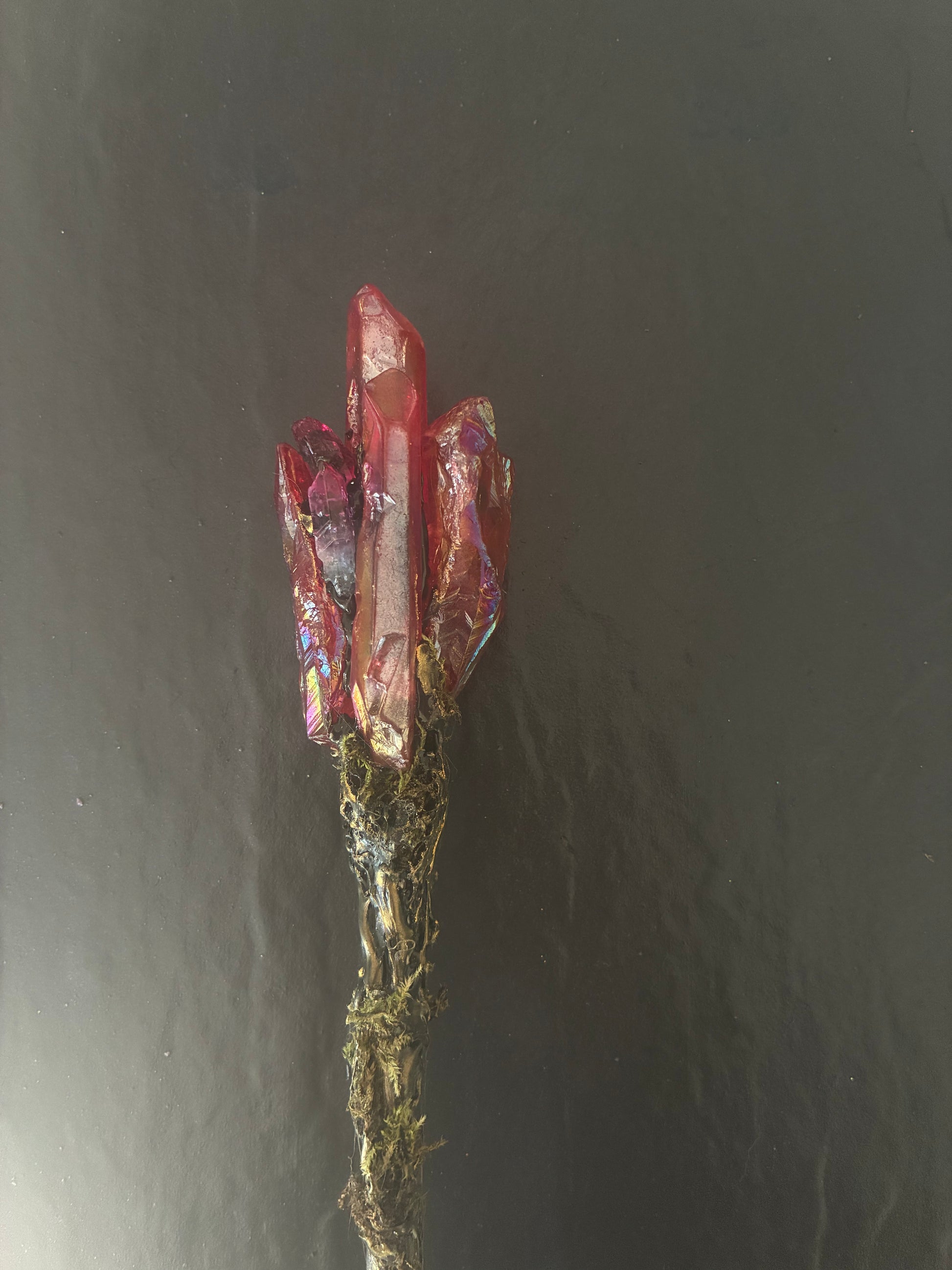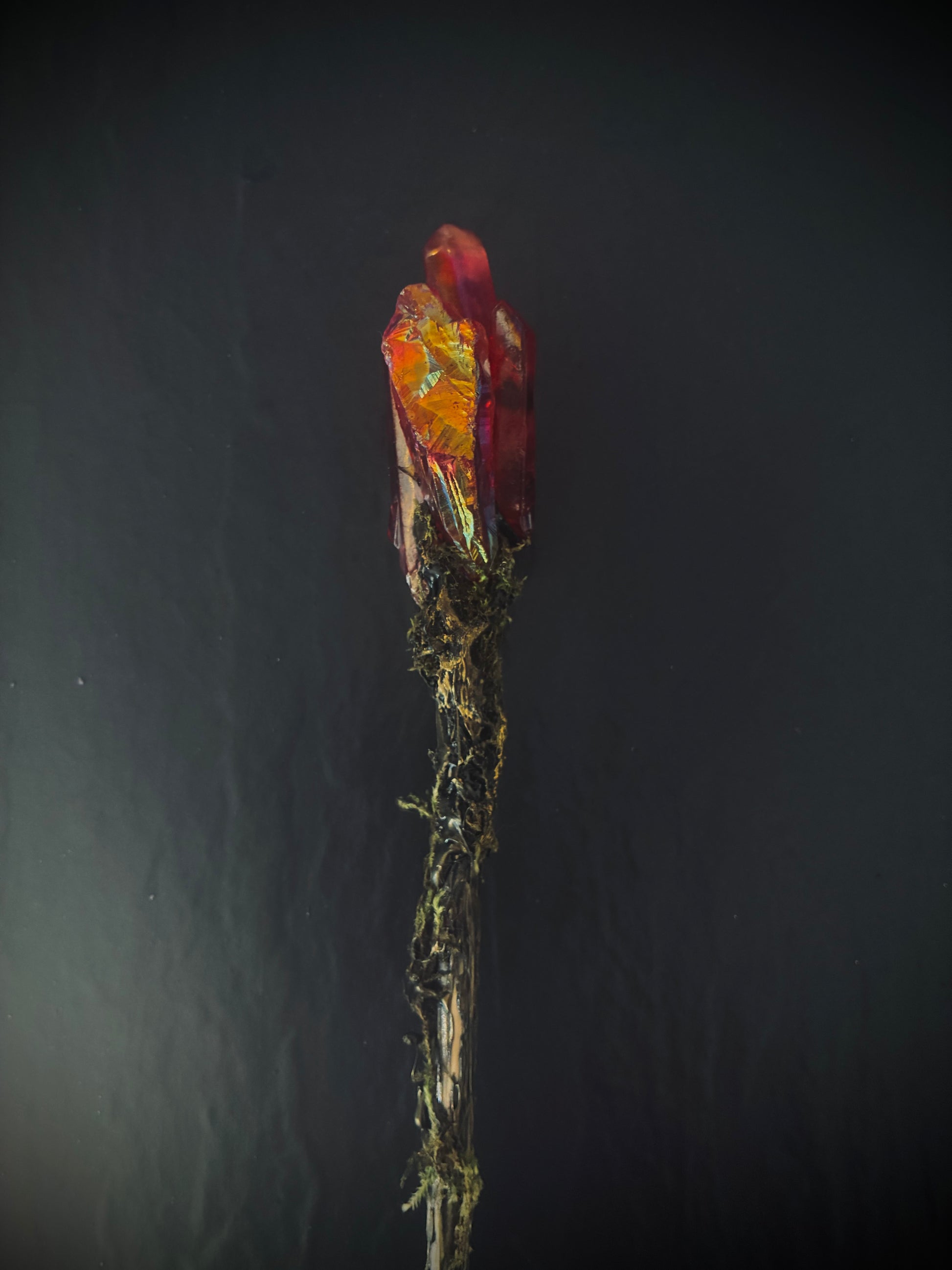 Blazing with fiery colors and wild charm, the Emberlight Wand is one of a kind. It’s a handmade wand that glows like a spark caught at twilight. Crowned with shimmering red and gold quartz crystals, it shines with the power of bonfire wishes, sunrise spells, and secret forest adventures. Wrapped in moss and wood, it carries both the warmth of flame and the whisper of the earth.