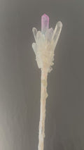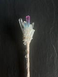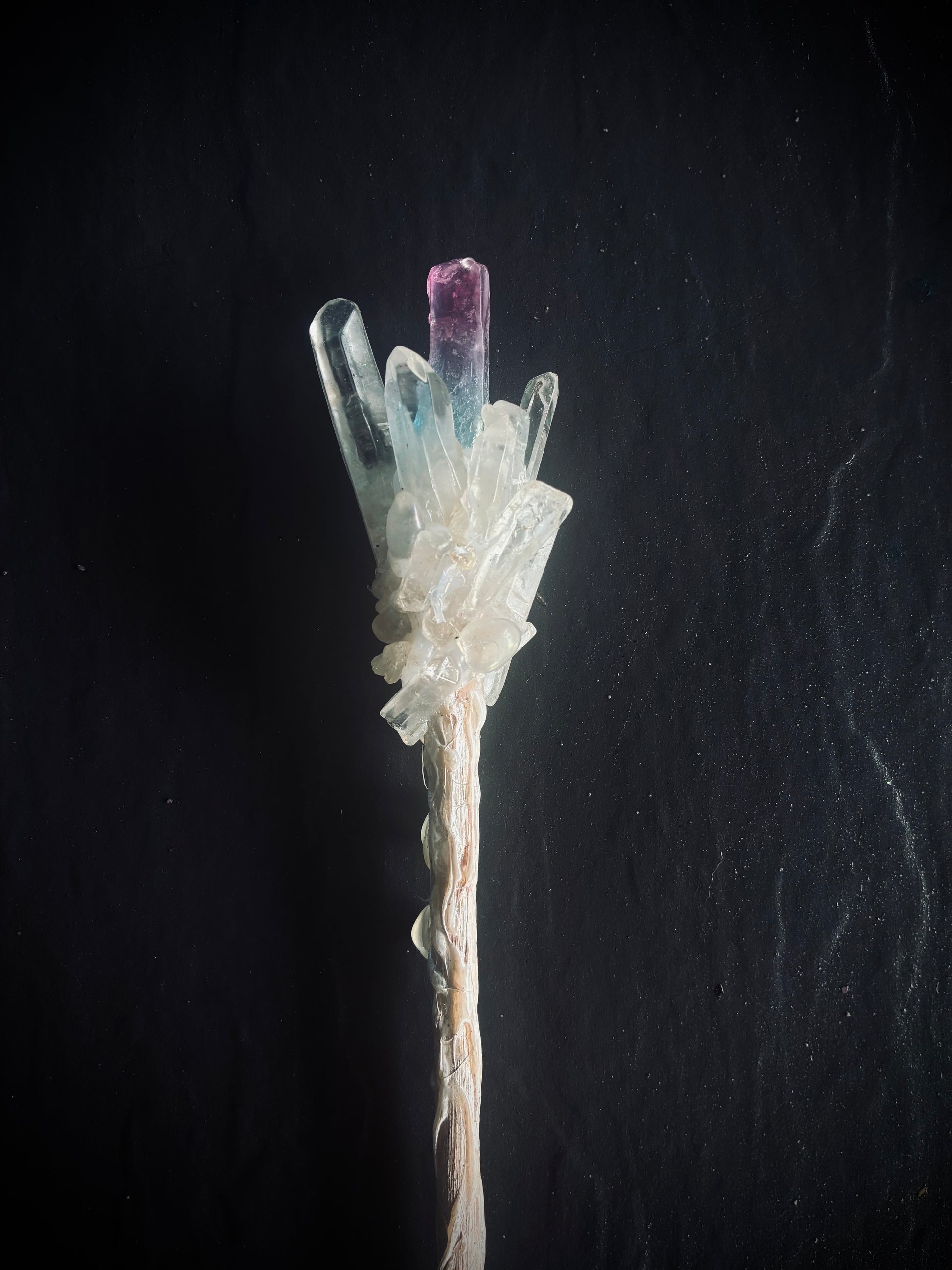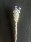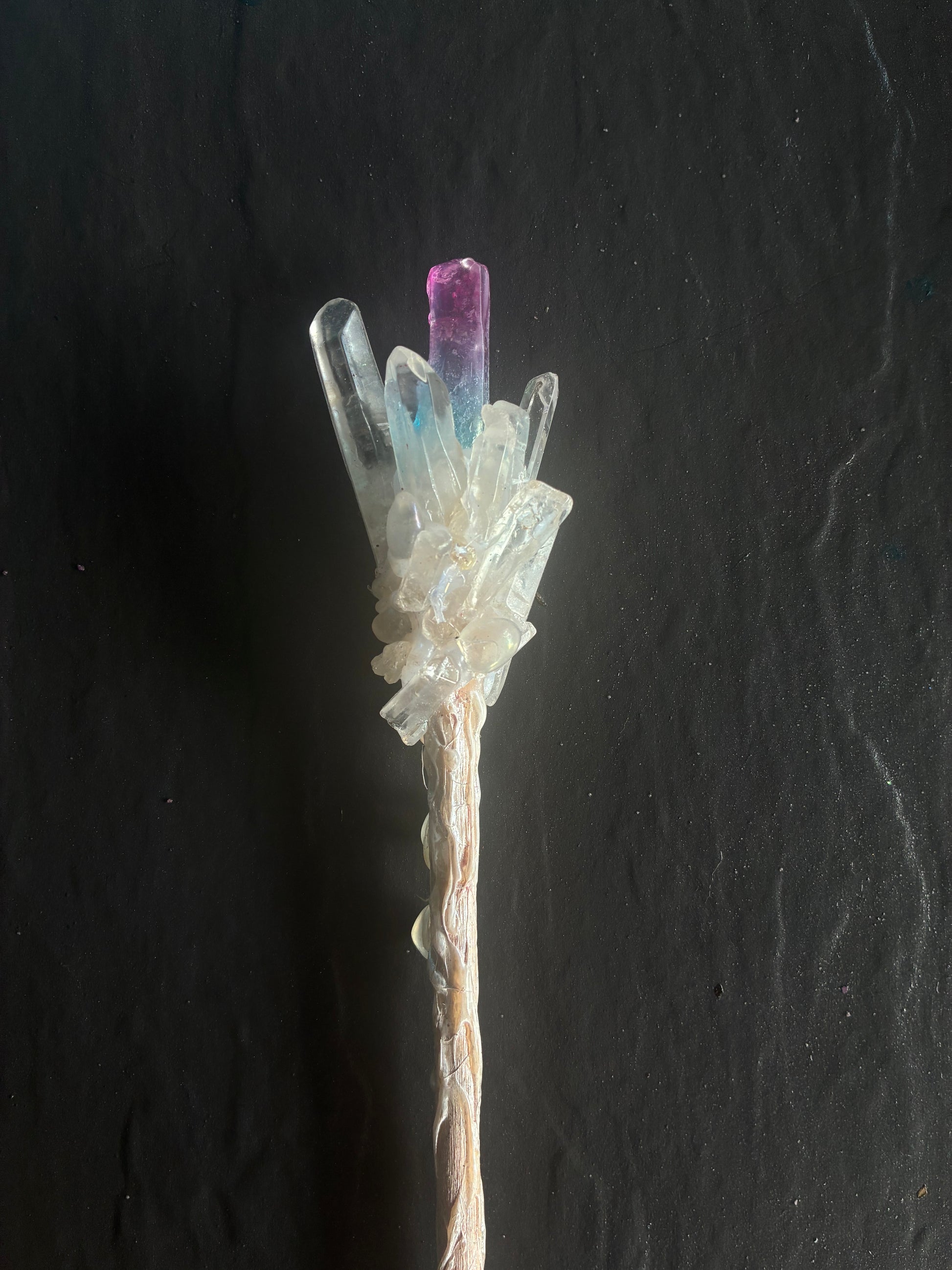 Delicate and dazzling, the Starlight Quartz Wand shimmers with playful magic. Topped with a glowing cluster of clear crystals and a radiant pink-and-blue quartz point, it’s a wand made for sunbeam spells, rainbow wishes, and secret fairy door adventures. Hand-painted in soft pearl tones, it glimmers like morning light caught on dew.